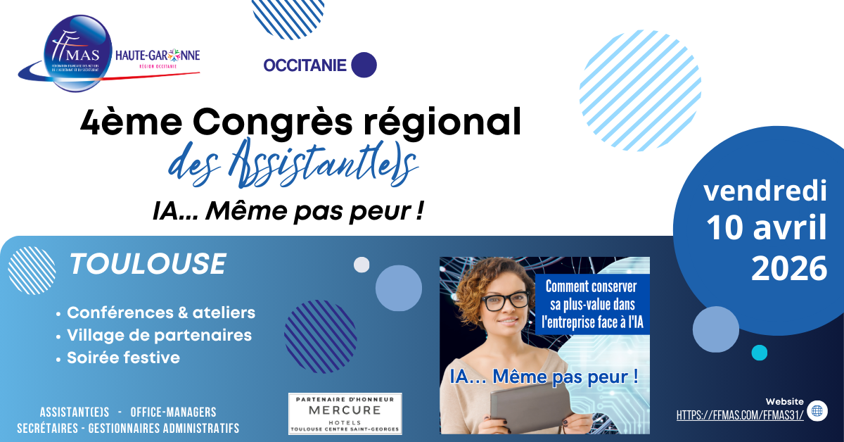 L’association FFMAS 31 organise le 4ème congrès régional en Occitanie le 10 avril 2026. C’est une occasion unique de découvrir les clés indispensables pour se préparer aux enjeux et compétences de demain (Intelligence Artificielle, cyber sécurité, nouvelles attentes managériales…), de se rencontrer, d’échanger sur les emplois, les perspectives d’évolution et spécialisations porteuses, réseauter, s’inspirer de bonnes pratiques, découvrir des prestataires utiles pour son quotidien professionnel.