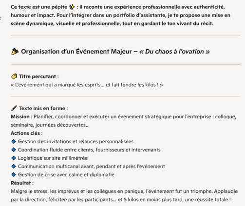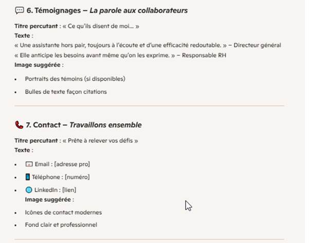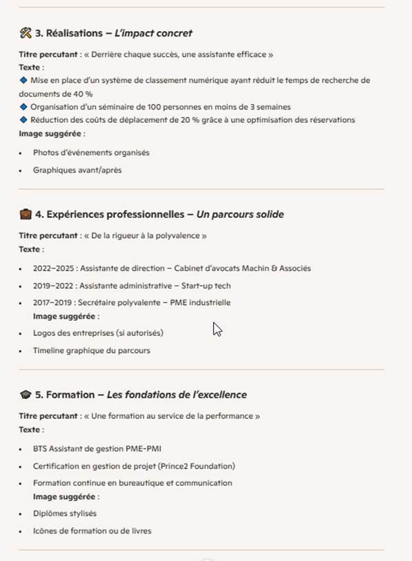 Bonjour Copilot, peux-tu STP mettre en forme (images, texte, photos…) de manière élégante le portfolio d’une assistante et peux-tu créer des titres percutants ?